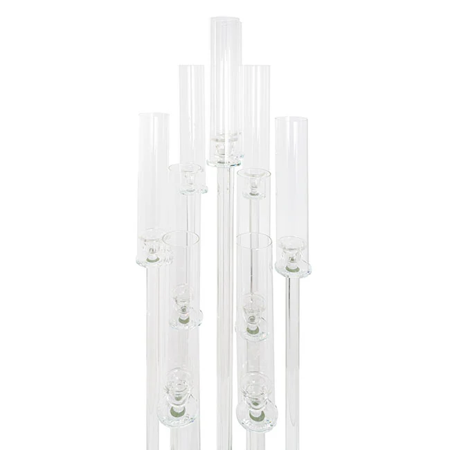 Please note, this candelabra can also be used without glass hurricane sleeves attached. Glass hurricane sleeves sit neatly on candle holders and replacement sleeves are available (SKU: 1101098CL). Each glass sleeve measures 6cm in diameter and 30cm tall. The tallest candle holders (without hurricane sleeves attached) measure 83cm tall. With hurricane sleeves attached, the candelabra measures 109cm at the tallest point. This candelabra accommodates 10 taper candles with a diameter of 2cm or less.